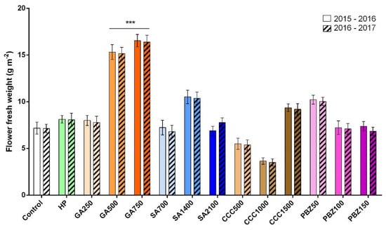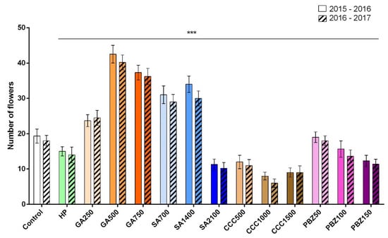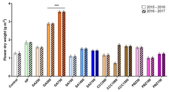 - Sajid, M.; Amin, N.; Ahmadand, H.; Khan, K. Effect of Gibberellic Acid on Enhancing Flowering Time in Chrysanthemum Morifolium. Pak. J. Bot. 2016, 48, 477–483. [Google Scholar]