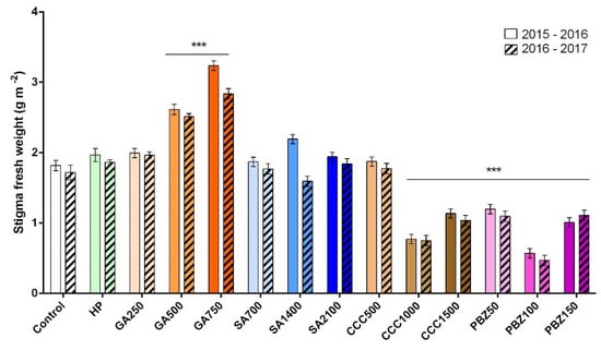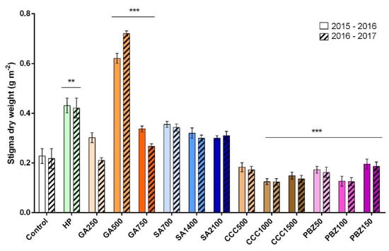 3.2. Flower and Stigma Number, Fresh Weight, and Dry Weight