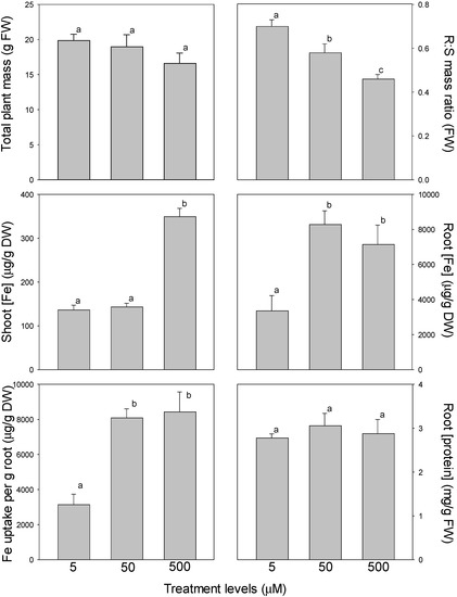 In tomato, total plant mass decreased significantly between 5 and 50 µM Fe, but did not decrease further between 50 and 500 µM Fe (Figure 3). Root-to-shoot mass ratio did not differ significantly among Fe levels. Both roots and shoots exhibited an increasing trend in Fe concentration as Fe availability increased. In shoots, Fe concentration increased 1.8-fold from 5 to 500 µM Fe, while in roots, Fe concentration increased more than 14-fold from 5 to 500 µM Fe. As with root Fe concentration, Fe uptake per g root also increased dramatically from 5 to 500 µM Fe (increasing 13.6 fold). Again, as in marigold, there were no differences in root protein concentrations among Fe levels.