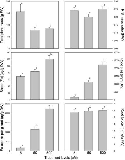 In marigold, both total plant mass and root-to-shoot mass ratio decreased as Fe availability increased from 5 to 50 µM and from 50 to 500 µM Fe (note: although total mass did not differ among treatments with ANOVA, a t-test indicated that 5 and 500 μM Fe were different from each other at p = 0.04) (Figure 2). Shoot Fe concentration did not increase from 5 to 50 µM Fe, but increased 2.4-fold from 50 to 500 µM Fe. Root Fe concentration, meanwhile, increased 2.5-fold from 5 to 50 µM Fe, but did not increase further from 50 to 500 µM Fe (500 μM was 1.8-fold higher than 5 μM). Fe uptake per g root increased 2.6-fold from 5 to 50 µM Fe, but did not increase further from 50 to 500 µM Fe. In contrast, the concentration of total protein in roots was unaffected by Fe availability.