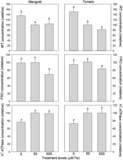 In both marigold and tomato roots, the relative concentration of IRT decreased from 5 to 50 µM Fe (albeit non-significantly in marigold) (Figure 4). It remained similar between 50 and 500 µM Fe in marigold, while it continued to decrease (albeit non-significantly) from 50 to 500 µM Fe in tomato (Figure 3). The relative concentration of FRO did not differ between 5 and 50 µM Fe in either species, but decreased non-significantly from 50 to 500 µM Fe in both species. In contrast, the relative concentration of H+-ATPase increased from 5 to 50 µM Fe, but did not differ between 50 and 500 µM Fe in both species.