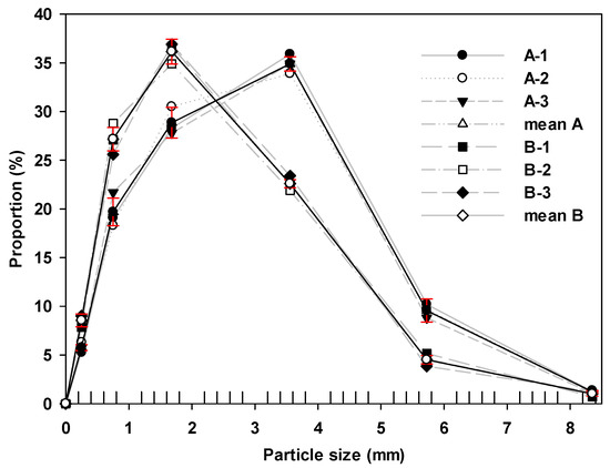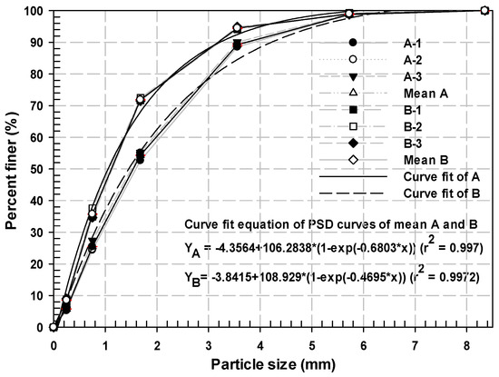 The particle distribution curves and curve fits for A and B are represented in Figure 2. The particle distribution curves of three samples of each EP were similar, while the percent finer value (DN) of B was higher than that of A in all corresponding particle sizes, which could be attributed to the total proportion of the particle size less than 1.68 mm. The proportions of particle size less than 1.68 mm as median value in A and B were 58.8% and 71.9%, respectively, showing that the proportions of B were higher by 17.1% than that of A.