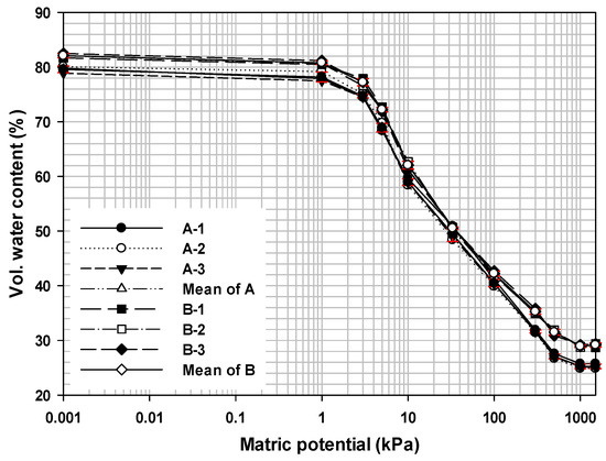 The particle-size distribution, which can influence the configuration of the pore space, has considerable effects on the water flow path and water retention capacity. The coefficient of curvature is an essential parameter that represents the continuity of the particles. For a given porosity, characteristic particle size and coefficient of curvature conditions are the governing variable affecting the particle composition [27]. Table 2 shows the particle sizes corresponding to DN, uniformity coefficient (Cu), and curvature coefficient (Cc) which were calculated by Equations (4) and (5) for A and B. Comparing the particle sizes of A and B for each corresponding DN, the particle sizes of A corresponding to D60, D30, and D10 were larger than those of B, and the mean spans of the particle size for A and B were similar between D30 and D60 while the mean span between D10 and D30 of B was smaller by 0.15 mm than that of A. However, the calculated particle sizes of D60 of A and B were 1.88 mm and 1.37 mm, showing that the pore size of B could be larger than that of A. Therefore, we could assume that the difference and proportion of particle size distribution could influence the water retention capacity in A and B. Using these DN values, the calculated means Cu and Cc for A and B were 6.71 and 1.16 and 6.68 and 1.14, respectively, revealing that both A and B are densely graded particle with a considerable range of particle size. Yang et al. [27] reported that the difference between the control particle size and the average particle size increases with increasing Cc. Therefore, the average particle size of B can be larger than that of A.