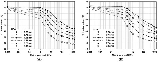 Water retention curves corresponding to the water potential ranging from 0 to −1500 kPa for six different median particle size ranges for EP A and B, respectively. (A): Turkey; (B): China.