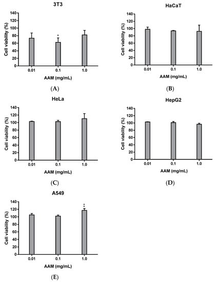 We evaluated the effect of increasing concentrations of AAM at 0.01, 0.1, and 1 mg/mL, in non-tumoral (3T3 and HaCaT) and tumoral (HeLa, HepG2 and A549) cell lines. As observed in Figure 2, AAM does not induce an important cytotoxicity in 3T3 and HaCaT (Figure 2A,B, respectively). However, a slightly lower viability has been recorded for fibroblasts than for keratinocytes; being the lowest cell viability recorded at 0.1 mg/mL AAM in 3T3 (62.4% cell viability).