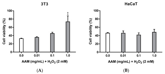 Cytoprotective activity of AAM in 3T3 (A) and HaCaT (B). Cells were incubated 24 h in the absence (white column) or in the presence of AAM (gray columns) and subsequently treated with 2 mM H2O2 for 2.5 h and finally cell viability was determined by MTT assay and expressed as a percentage with respect to untreated cells. H2O2 cell viability in absence of the extract was used as a positive control. Results are expressed as mean ± standard error of n = 3 (3T3) and n = 2 (HaCaT). A two-way analysis of variance (ANOVA) and a Bonferroni post hoc assay have been performed. Statistical differences were considered as follows: ** p ≤ 0.01 in comparison with positive control.