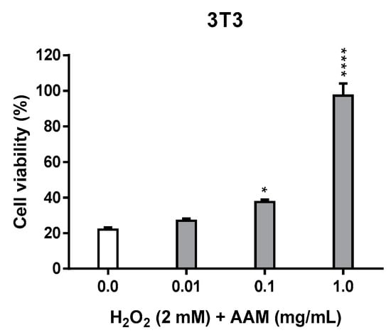 In the case of cellular repair activity, cells were previously incubated with H2O2 for 2.5 h. Then, the medium was discarded, cells were washed and finally treated with 0.01, 0.1, and 1 mg/mL AAM in 5% FBS-DMEM for 24 h. Finally, after AAM treatment, cellular repair activity was calculated by determining cell viability with the NRU and MTT tests.