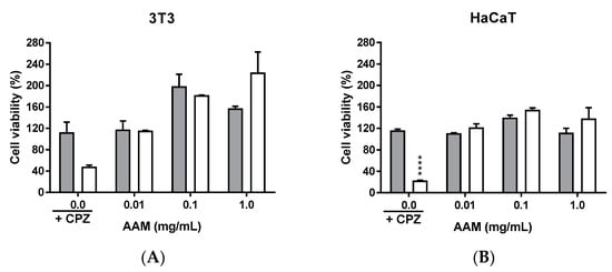 Phototoxicity activity of AAM in 3T3 (A) and HaCaT (B) cell lines obtained by MTT assay and expressed as percentage of cell viability respect to the correspondent control cells. Chlorpromazine cell viability was used as positive control. Gray columns correspond to non-exposed cells to UVA light and white columns correspond to cells exposed to 1.8 J/cm2 of UVA light. Results are expressed as mean ± standard error of n = 3. A two-way analysis of variance (ANOVA) and a Bonferroni post hoc assay have been performed. Statistical differences were considered as follows: **** p ≤ 0.0001 in comparison with the equivalent non-irradiated condition homologue.