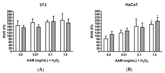 Intracellular ROS induced by 1 and 2 mM H2O2 for 2 h treatment after 24 h incubation with AAM in 3T3 (A) and HaCaT (B) cells. H2O2 treated cells were used as positive control. White columns correspond to 1 mM H2O2 and gray columns correspond to 2 mM H2O2. Results are expressed as mean ± standard error of n = 3. A two-way analysis of variance (ANOVA) and a Bonferroni post hoc assay have been performed. Statistical differences were considered as follows: * p ≤ 0.05 in comparison with the corresponding positive control.