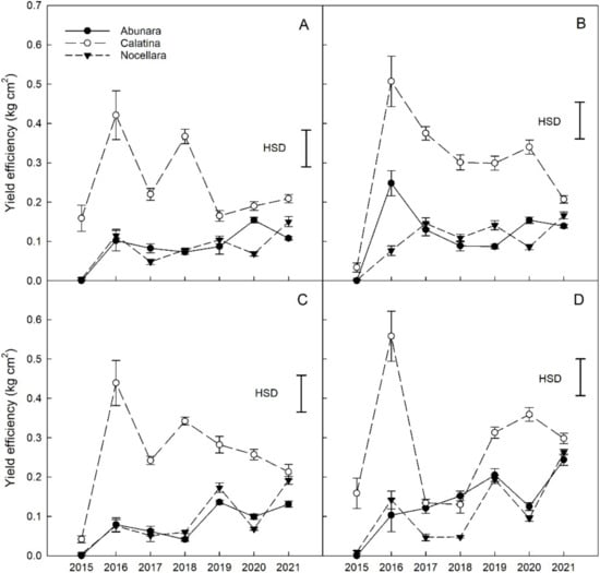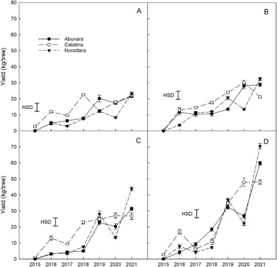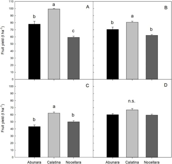 - Proietti, P.; Nasini, L.; Reale, L.R.L.; Caruso, T.; Ferranti, F. Productive and vegetative behavior of olive cultivars in super high-density olive grove. Sci. Agric. 2015, 72, 20–27. [Google Scholar] [CrossRef][Green Version]