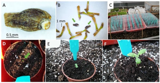 Fruit (achenes, considered as seed) of chrysanthemum (A); fruits (seeds) of chrysanthemums (pointed with an arrow) among dried tubular florets (B); seeds planted in pots covered with perforated film (C); plant growth phase I—beginning of germination (D); phase II—fully developed cotyledons (E); phase III—the first fully developed leaf (F).