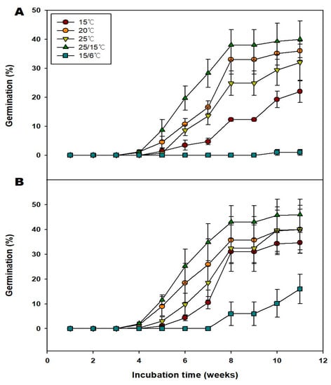 - Jang, G.H.; Chung, J.M.; Rhie, Y.H.; Lee, S.Y. Seed dormancy class and ecophysiological Features of Veronicastrum sibiricum (L.) Pennell (Scrophulariaceae) Native to the Korea Peninsula. Plants 2022, 11, 160. [Google Scholar] [CrossRef] [PubMed]