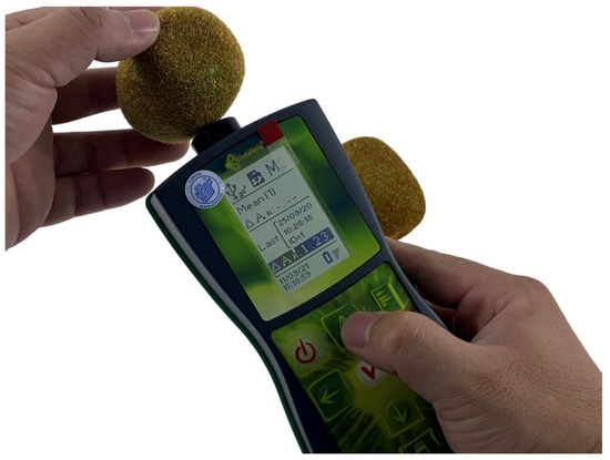 It is common to use aspects of fruit composition, including soluble solids concentration (SSC), firmness, flesh color, and dry matter (DM) as indices with which to time kiwifruit harvest [3]. In New Zealand, DM measured at harvest is used as an indicator of the potential ripe fruit SSC and thereby eating quality [2,4]. DM and SCC are generally determined by destructive methods on a sample of fruit, although there are also non-destructive methods available [5], largely based on visible and near infrared (Vis/NIR) spectroscopy. SSC and DM have long been estimated by Vis/NIR [6,7]. More recently, impact or acoustic impact devices have been used for firmness measurement [8].