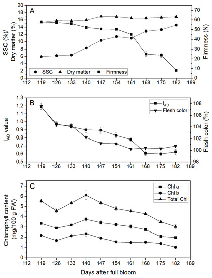 Maturation of Actinidia chinensis var. chinensis ‘Donghong’ fruit in 2020. (A) Fruit firmness, soluble solids content (SSC), and dry matter (DM); (B) Kiwi-Meter IAD index and flesh color; and (C) chlorophyll a (Chl a), chlorophyll b (Chl b), and total chlorophyll content. Values are means of 20 fruit (±s.e.m.), except chlorophyll data, for which n = 3 (±s.e.m.).