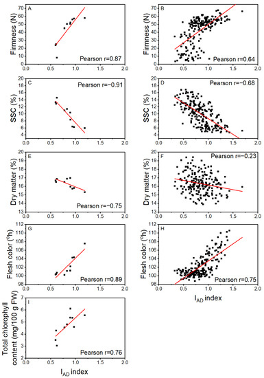 DA Meter data have been reported to correlate well with chlorophyll content, and thus fruit maturity, for a range of fruit including apple [11], peach [12,13], apricot [14], and plum [15], as well as kiwifruit [9,10]. The IAD index is therefore promoted as having potential as a harvest index. The device has also been reported to indicate fruit postharvest quality, storability, and risk of physiological disorders for certain fruit species [16,17,18,19].
