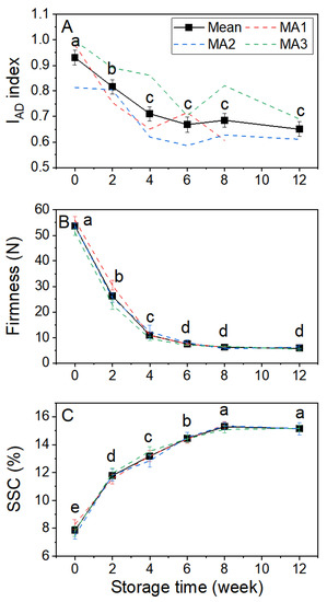 The change in IAD index (A), firmness (B), and soluble solids content (SSC, (C)) of Actinidia chinensis var. chinensis ‘Donghong’ fruit during storage at 1 °C for 12 weeks. Bold lines and symbols are the mean of three maturity areas (±s.e.m.), dashed lines the individual maturity areas (MA) for which n = 60 at harvest and 45 at other times. Values not sharing a common letter differ at p = 0.05.