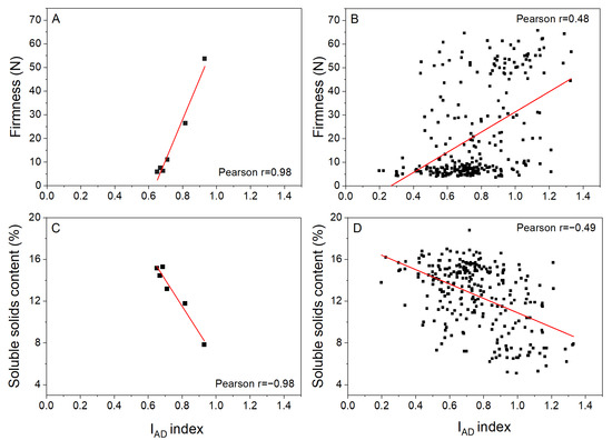 Associations between IAD and fruit firmness (A,B) and soluble solids content (C,D) for Actinidia chinensis var. chinensis ‘Donghong’ fruit from 3 maturity areas stored for 0, 2, 4, 6, 8, and 12 weeks at 1 °C. Associations are based on sample averages for three maturity areas (A,C) and individual fruit (B,D) data. At each assessment, 15 fruit were measured per maturity area.