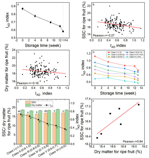 The average IAD value gradually decreased from 0.87 at harvest to 0.65 after 12 weeks of storage, with a further sharp decline to 0.58 after 7 days at 20 °C (Figure 6A). The correlations of IAD index with rSSC and rDM after shelf-life were small at r = −0.27 for rSSC (Figure 6B) and r = −0.16 for rDM (Figure 6C). These correlation coefficients suggest that the IAD index value had little ability to discriminate accurately rSSC or rDM. However, rSSC was strongly correlated with rDM at r = 0.86 (data not shown).