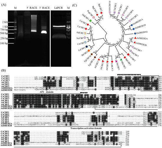 The tea plant genome sequencing program had not yet been complete, and there was only partial ORF (open reading frame) sequence of CsCBF2 gene existed in the SSH identified cDNA clone when our study began. So, the full length cDNA of CsCBF2 gene was cloned by RACE (rapid amplification of cDNA ends) using the SMARTTM RACE cDNA kit (Clontech, Palo Alto, CA, USA). Total RNA of tea plant was isolated using RNeasy Plant Mini Kit (Qiagen, Hilden, Germany). 5′ and 3′ RACE ready cDNAs were prepared by using the total RNA of tea plant as template following the manufacture’s instruction, and the 10 × Universal Primer A Mix provided in the SMARTTM RACE cDNA kit and CsCBF2 gene specific primers (GSPs) were used for 5′ and 3′ RACE reactions. The GSPs were designed according to the partial CsCBF2 ORF sequence identified before using the web-based Primer 3.0 program (https://primer3.ut.ee/, accessed on 6 June 2014; Supplementary Table S1). PCR procedures for the 5′ and 3′ RACE reactions were as follows: 94.0 °C 5 min, followed by 30 cycles of 94.0 °C 30 sec, 55.0 °C (5′ RACE) or 50.0 °C (3′ RACE) 30 s, and 72.0 °C 1 min 30 s. The RACE reactions were completed on a PCR instrument (Bio-Rad, Hercules, CA, USA). The RACE products were characterized and sequenced, and were assembled with the partial CsCBF2 gene sequence inserted in the SSH-identified cDNA clone. The full-length cDNA of CsCBF2 was confirmed by long distance PCR (LdPCR) with specific primers (Table S1) following the manufacture’s instruction. The ORF of CsCBF2 was predicted by ORFfinder (https://www.ncbi.nlm.nih.gov/orffinder/, accessed on 1 July 2014). Molecular weight and isoelectric point of CsCBF2 were analyzed by the ExPASy online tool (https://www.expasy.org/, accessed on 15 July 2014).