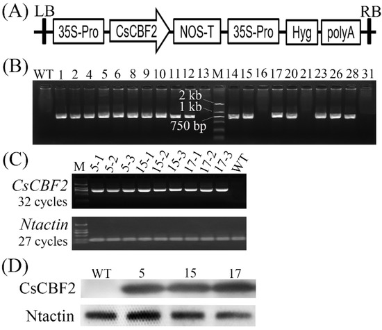 3.3. Generation and Molecular Identification of CsCBF2 Transgenic Plants