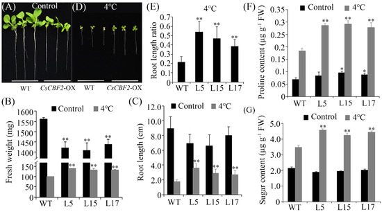 Phenotypic and physiological responses of CsCBF2-overexpressing transgenic plants under cold stress conditions. Data are means ± standard deviation (SD) of three independent experiments. Significant differences between WT and transgenic plants under control and cold stress conditions are indicated by * p < 0.05, ** p < 0.01; Student’s t-test. (A,D) exhibit the phenotypes of CsCBF2-overexpressing tobacco plants (CsCBF2-OX) and wild type tobacco plant (WT) growing on 1/2 MS culture medium for 20 days, respectively, under normal growth conditions (control) and cold stress conditions (4 °C). (B) The fresh weight of CsCBF2-OX L5, L15, L17, and WT under normal (control) and cold stress (4 °C) conditions, after growing on 1/2 MS culture medium for 20 days. (C) The root length of CsCBF2-OX L5, L15, L17, and WT under normal (control) and cold stress (4 °C) conditions, after growing on 1/2 MS culture medium for 20 days. (E) The root length ratio of CsCBF2-OX L5, L15, L17, and WT. The root length ratio is the root length of CsCBF2-OX L5, L15, L17, and WT under cold stress conditions (4 °C) correspondingly to that under normal growth conditions (control). (F,G) respectively represents the proline and soluble sugar content in CsCBF2-OX L5, L15, L17, and WT under normal growth conditions (control) and cold stress (4 °C).