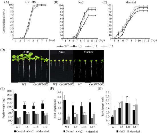 Phenotypic and physiological responses of CsCBF2-overexpressing transgenic plants under salt and drought stress conditions. Data are means ±standard deviation (SD) of three independent experiments. Significant differences between WT and transgenic plants under control and stress conditions are indicated by * p < 0.05, ** p < 0.01; Student’s t-test. (A–C) respectively show the germination rate of WT and CsCBF2-OX L5, L15, L17 growing on 1/2 MS culture medium, on 1/2 MS culture medium with 150 mM NaCl, on 1/2 MS culture medium with 400 mM mannitol. (D) The phenotype of WT and CsCBF2-OX growing on 1/2 MS culture medium, on 1/2 MS culture medium with 200 mM NaCl, on 1/2 MS culture medium with 200 mM mannitol. (E) The fresh weight of WT and CsCBF2-OX L5, L15, L17 under normal conditions (control), salt stress, and high concentration of mannitol simulated drought stress for 20 days. (F) Root length of WT and CsCBF2-OX L5, L15, L17 under normal conditions (control), salt stress, and high concentration of mannitol simulated drought stress for 20 days. (G) The root length ratio of WT and CsCBF2-OX L5, L15, L17. The root length ratio is the root length of CsCBF2-OX L5, L15, L17, and WT respectively under salt and mannitol-simulated drought stress correspondingly to that under normal growth conditions (control).