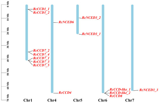 Chromosomal distribution of the RcCCDs. The scale of the physical distance of chromosomes is located on the left side of the picture. Chr1-7 represents chromosome numbers 1–7.