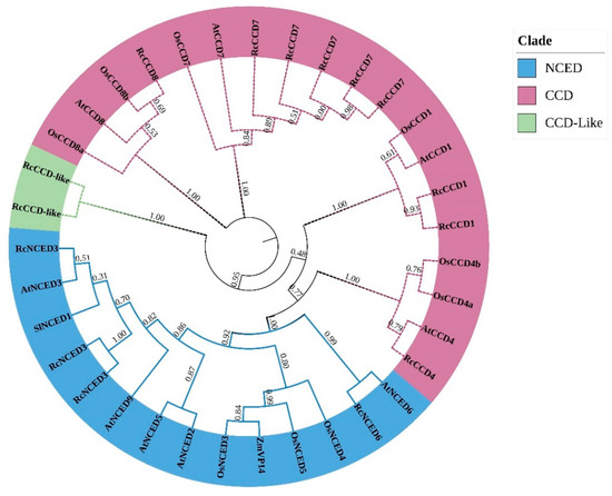 Phylogenetic analysis of the RcCCDs. The dendrogram was drawn by iqtree with the maximum likelihood method (ML), JTT amino acid substitution model. CCD clade was purple, NCED clade was blue, and CCD-Like was green.
