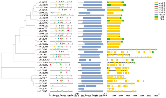 Dendrogram, MEME motifs, pfam, and exon–intron structures of CCDs in rose, arabidopsis, rice, tomato, and maize. Motif1-6 represents conserved motifs of the MEME structure diagram. Blue boxes represent the RPE65 domain. Yellow boxes, green boxes, and black lines in the exon–intron structure diagram represent CDS, UTR, and introns, respectively. Scales (nt) were provided as a reference.