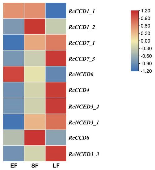 Ten genes (RcCCD1_1, RcCCD1_2, RcCCD4, RcCCD7_1, RcCCD7_3, RcCCD8, RcNCED3_1, RcNCED3_2, RcNCED3_3, RcNCED6) were differentially expressed at three stages. Among them, RcCCD4, RcCCD7_1, RcCCD7_3, RcNCED3_1, RcNCED3_2, RcNCED3_3 were significantly up-regulated in the SF stage, and RcCCD7_1, RcCCD7_3, RcNCED3_1, RcNCED3_2, RcNCED3_3 were significantly down-regulated in the LF stage, which was consistent with the accumulation of volatile compounds. This indicated that these genes may be involved in the biosynthesis of volatile compounds (Table S3, Figure 4).