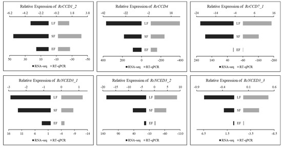 The expression of RcCCD1_2 increased gradually from EF to SF and then to the LF stage and was significantly higher in the LF stage, which was different from the expression patterns of RcCCD4, RcCCD7, and RcNCED3. It has been reported that the expression of CpCCD1 in summer squash (Cucurbita pepo) [33] also showed an elevated trend during the flowering process. Among the fifteen RcCCDs, eight genes were detected at EF, SF, and LF stages by qRT-PCR. Among them, six genes were detected in EF, SF, and LF simultaneously, and their expression trends were the same as the RNA-seq, which proved that the transcriptome data were accurate and reliable (Figure 5).