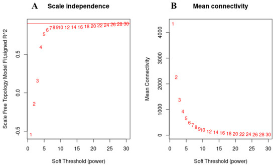 The election of WGCNA soft threshold. (A): Scale independence diagram. The horizontal axis was soft thresholds, and the vertical axis was scale-free fit indices, with 0.9 at the red line. (B): Average connectivity plot. The horizontal axis was the soft threshold, and the vertical axis was the average connectivity.