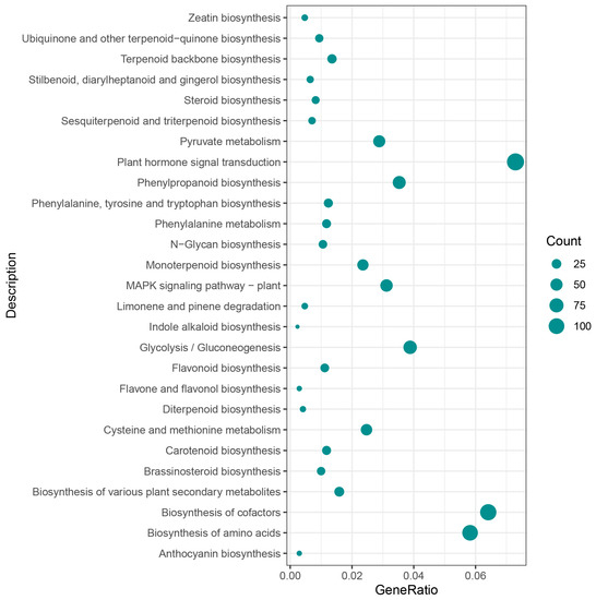 Within seven modules, the top 10% of genes connectivity, kME > 0.8, and the top 500 weighted values within a single module were screened as candidate hub genes, totaling 162 hub genes. Then ten RcCCDs and five NUDX genes (related to) were added to a total of 177 genes for co-expression network map display, based on which 20 hub genes were further screened as shown in the pink circles (Figure 10, Tables S3 and S7). The differential expression analysis revealed that these 20 genes had the highest expression in the EF stage, all of them were down-regulated in the SF stage, and 19 of them were not expressed in the LF stage, indicating that these genes all exercised their functions in the early flowering stage with strict temporal specificity (Table S3, Figure 11). These hub genes are involved in Carbon metabolism (map01200), Biosynthesis of amino acids (map01230), Phenylpropanoid biosynthesis (map00940), Aminoacyl-tRNA biosynthesis (map00970), and other metabolic pathways. Twenty hub genes were enriched not only for the phenylpropanoid metabolic process (GO:0009698), phenylpropanoid biosynthetic process (GO:0009699) but also for many biological processes related to the carbohydrate metabolic process (GO:0005975), and secondary metabolic process (GO:0019748). The accumulation of volatile compounds was closely related to floral development, and we also enriched floral organ development (GO:0048437). These suggested that WGCNA could indeed identify co-expression modules and genes that were highly correlated with the target traits and had biological significance.