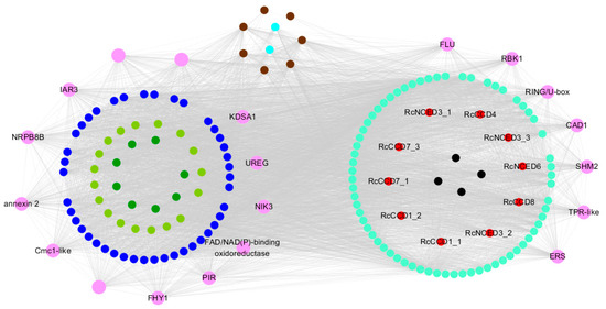 In this study, gene co-expression modules with correlation coefficients r ≥ 0.7 and modules containing RcCCDs were used as candidate target modules, and KEGG functional enrichment analysis was performed, while the top 10% of connectivity, kME > 0.8, and top 500 genes weighted within a single module were used as criteria to screen genes within hub modules. Finally, Cytoscape software (v 3.7.1, Washington, DC, USA) was used to visualize the gene co-expression regulatory network within the target modules [32].