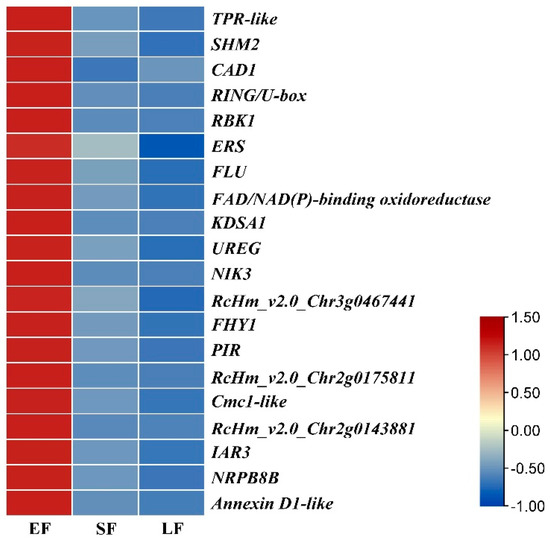 Expression patterns of the 20 hub genes at three flower development stages in R. hybrida ‘tianmidemeng’. Legend from red to blue indicated gene expression levels from high to low. EF: early-flowering, SF: semi-flowering, LF: late-flowering.