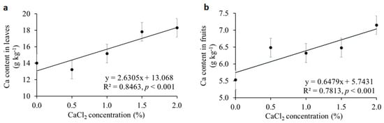 In summary, the concentrations of Ca2+ in the leaves and fruits of the fig tree increased linearly as a function of CaCl2 applications. There was an increase of 14.03% in leaves and 29.3% in fruits, with a consequent reduction in the activity of pectinolytic enzymes, weight loss and fruit rot decay percentage. The fig tree Roxo de Valinhos sprayed with 1.0% CaCl2 presented fruits with larger diameters and greater firmness, as well as higher total phenolic concentrations and greater antioxidant activity for fruit peel and pulp.