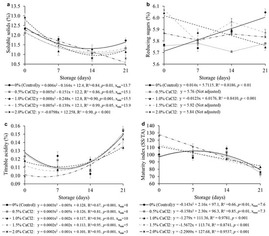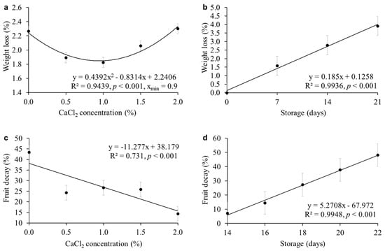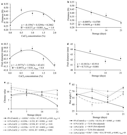 The analysis was based on average data from the 2019 and 2020 seasons. The normality hypothesis was tested by the Shapiro–Wilk test, and the F test (1 and 5% levels of significance) was used in the analysis of variance to detect the difference between the factors. When a significant difference was found for the sources of variations, regression analysis (linear and quadratic) was used to compare the treatment means for the data of the plots (CaCl2 concentration) and subplots (storage time). To ensure the homogeneity of variances in the regression analysis, Grubb’s test was applied to verify the presence of outliers for each concentration level.