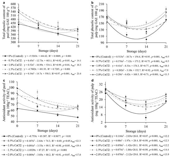There was a higher concentration of total phenols and, consequently, greater antioxidant activity of the peel in relation to the fruit pulp, regardless of CaCl