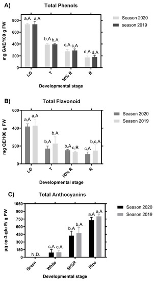 Evolution of the Volatile Organic Compounds, Phenols and Antioxidant Capacity during Fruit Ripening and Development of Rubus ulmifolius Schott Fruits