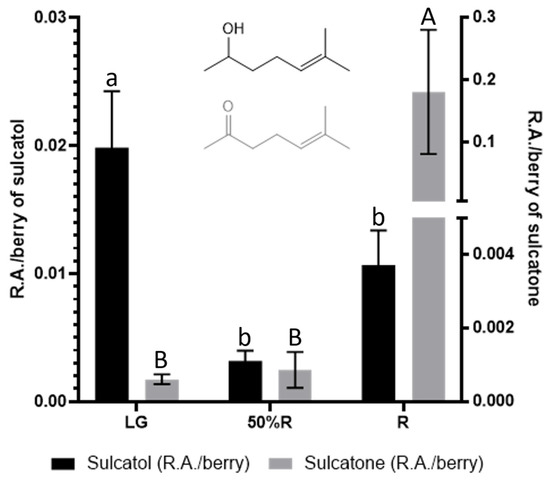 | Terpenoids | 0.189 ± 0.038 A | 0.011 ± 0.002 B | 0.169 ± 0.078 A |