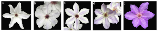 The flowers of C. tientaiensis used in this study were provided by the Zhejiang Institute of Subtropical Crops, Wenzhou, Zhejiang Province, China. These species were preserved in the National Clematis Germplasm Resource Center, Wenzhou, Zhejiang Province, China (C. tientaiensis voucher code: W-2017–12). Five flower colours of C. tientaiensis, namely, white (TTCB), lilac and white (TTJD), purple and white (TTJ), dark purple alternate (TTJZ), and dark purple (TTSZ) (Figure 1), were selected to explore the colour variations related to anthocyanin metabolic content. Fresh flowers of C. tientaiensis were collected, stored in liquid nitrogen, and then immediately stored at −80 °C.