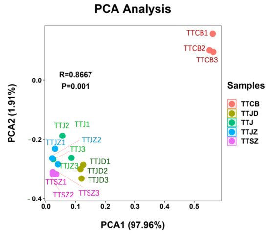 Significantly regulated metabolites between groups were determined by VIP ≥ 0, and absolute Log2FC (fold change) ≥ 1.0. VIP values were extracted from the orthogonal projections to latent structures discriminant analysis (OPLS-DA) result, which also contained score plots and permutation plots, and were generated using the R package MetaboAnalystR. The data were log-transformed (log2) and mean-centered before OPLS-DA. To avoid overfitting, a permutation test (200 permutations) was performed [23]. ChemStation (version E.02.02.1431, Agilent, CA, USA) software and ChromaTOF software (version 4.34, LECO, St Joseph, MI, USA) were used to analyse the processed data [24], and the Fiehn or National Institute of Standard and Technology (NIST) database was used to annotate the metabolites [25]. Unsupervised principal component analysis (PCA) was performed by the statistics function prcomp within R (www.r-project.org, accessed on 1 March 2022) [26]. The data were unit-variance-scaled before unsupervised PCA. Differentially accumulated metabolites were identified by the fold change, which represents the ratio of expression amount between two samples (groups), and the p value was calculated by the t test. The metabolites with fold change ≥ 2 and fold change ≤ 0.5 were selected as the final differentially accumulated metabolites [27]. A Venn diagram and a heatmap were generated using the Lianchuan Bio Cloud Platform (https://www.lc-bio.cn/overview, accessed on 22 March 2022) with the default model.