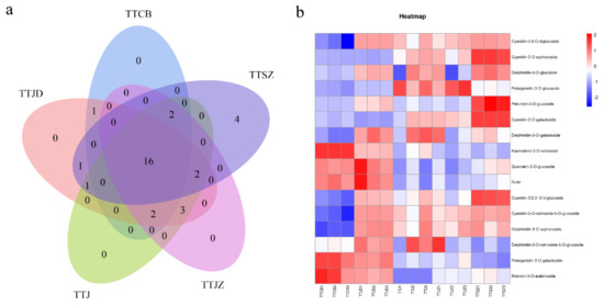 The Venn diagram of the five groups indicated that 16 compounds were expressed in each group of flowers with a different colour (Figure 3a). Then, a heatmap of the coexpressed metabolites was constructed. The results indicated that the five cyanidin numbers (cya-3,5,3′-O-triglucoside, cya-3,5-O-diglucoside, cya-3-O-galactoside, cya-3-O-rutinoside-5-O-glucoside, cya-3-O-sophoroside) were most highly expressed in the dark purple flowers (TTSZ) (Figure 3b).