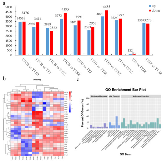 DESeq2 was used to analyse differentially expressed genes (DEGs). The number of DEGs in the C. tientaiensis flowers was statistically analysed, and a Venn diagram was constructed. A total of 13,559 DEGs were detected in the 10 comparison groups. The results of the DEG analysis indicated the largest number of DEGs between TTJD and TTSZ (4025 upregulated and 4655 downregulated DEGs), followed by the comparison between TTCB and TTSZ (3772 upregulated and 4395 downregulated DEGs). In addition, the lowest number of DEGs was observed between TTJ and TTJZ (80 upregulated and 202 downregulated DEGs) (Figure 5a). In addition, a heatmap of some DEGs (structural genes in anthocyanin biosynthesis and transcription factor genes that compose the MBW complex) was constructed (Figure 5b). The results showed that gene expression was divided into two groups: TTCB and TTJ clustered into one group, while other flower colour samples clustered into another group. For further analyses, GO terms on specific DEGs were built, and the result indicated that most genes had molecular function (Figure 5c).