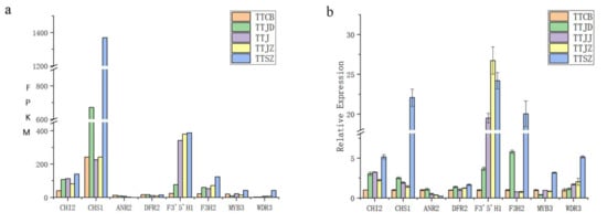 Eight unigenes were selected for qRT‒PCR to identify the reliability of the RNA-seq data, including structural genes and transcription factor genes. The results showed a similar expression pattern of the FPKM level to those genes obtained in the RNA-seq data (Figure 6), indicating that the RNA-seq analysis results were reliable, which would be helpful for further study of anthocyanin biosynthesis among differently coloured flowers of C. tientaiensis.