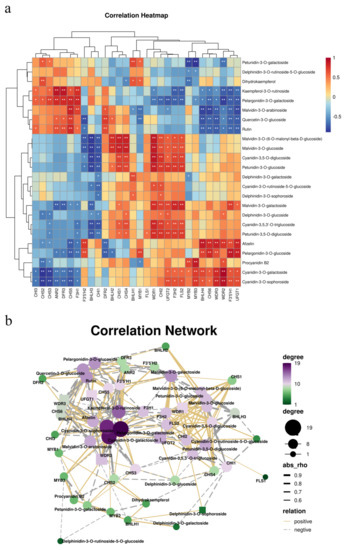 Correlation analysis of the genes related to anthocyanin and differentially accumulated metabolites. (a) Heatmap of metabolite abundance according to hierarchical clustering analysis. *: p < 0.05, **: p < 0.01. (b) The results of the correlation analysis between anthocyanin genes and differentially expressed metabolites.