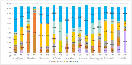 Relative percentage of volatiles in Veronica species from the hydrosols extracted with Clevenger hydrodistillation and microwave-assisted distillation: monoterpene hydrocarbons (MH), oxygenated monoterpenes (OM), sesquiterpene hydrocarbons (SH), oxygenated sesquiterpenes (OS), phenolic compounds (PD), hydrocarbons (H), a common group (CG) of acids, alcohols, and esters and oxygenated diterpene (OD).