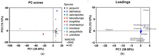 (a) PCA analyses of volatile compounds of 9 Veronica species–hydrodistillation (HD) and microwave assisted extraction (MAE); (b) PCA loading plots of volatiles from the first and second principal component.