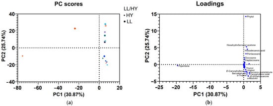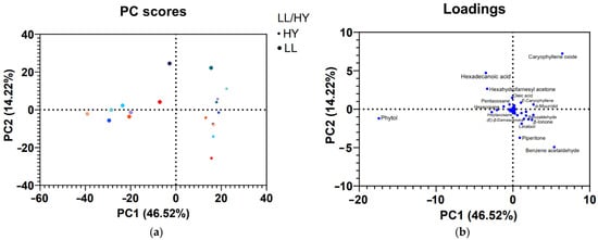 (a) PCA score plot for LLs (lipophilic layer) and hydrosols (HY) from HD method; (b) PCA loading plots of HD volatiles from the first and second principal component. The color palette represents the same species as in Figure 2a.