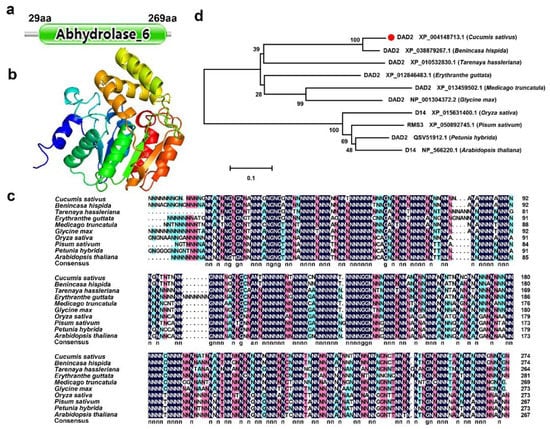 Sequence analysis of CsDAD2. (a) The functional domain of CsDAD2; (b) the tertiary structure of CsDAD2. Using a single template with the highest score, a total of 271 amino acid residues were modeled with 100% confidence. This picture is colored by the end of the rainbow from N to C; (c) sequence alignment of CsDAD2 and its homologs. The black, pink, and blue backgrounds represent 100%, 75%, and 50% similarities; (d) the phylogenetic relationship between CsDAD2 and its orthologs in other plants. Supplementary Table S2 lists the accession number of DAD2.